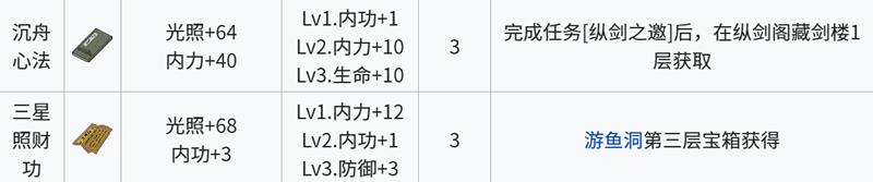 沉舟心法与三星照财功为初期可修习的3级内功。沉舟心法提供40点内力与64点光照,完成纵剑之邀任务后可在纵剑阁获取。三星照财功仅提升3点内功,但光照加成达68点,适合注重光照收益的玩家,可通过游鱼洞第三层获得。这两本心法是江城创业记新手阶段较为实用的选择,获取门槛较低,适合快速提升基础属性。