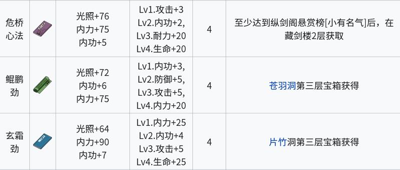危桥心法、鲲鹏劲与玄霜劲为4级上限内功。危桥心法增加68点光照、75点内力与5点内功。鲲鹏劲提供72点光照、75点内力与6点内功。玄霜劲则加成64点光照、90点内力与7点内功。这三本心法在江城创业记中期具备较强竞争力,属性全面,适合过渡阶段使用。获取方式多与特定副本或挑战相关,需玩家具备一定战力基础。