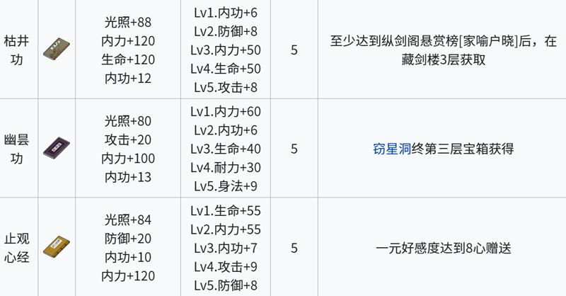 幽昙功、止观心法与野夫真经可提升至5级。幽昙功除基础属性外额外提供20点攻击力,适合输出型角色。止观心法增加20点防御力,强化生存能力。野夫真经则大幅提升100点耐力,并附加2点内力恢复,适合持久作战。这三本内功在江城创业记中后期逐渐显现优势,属性加成更加细化,可根据角色定位进行选择。