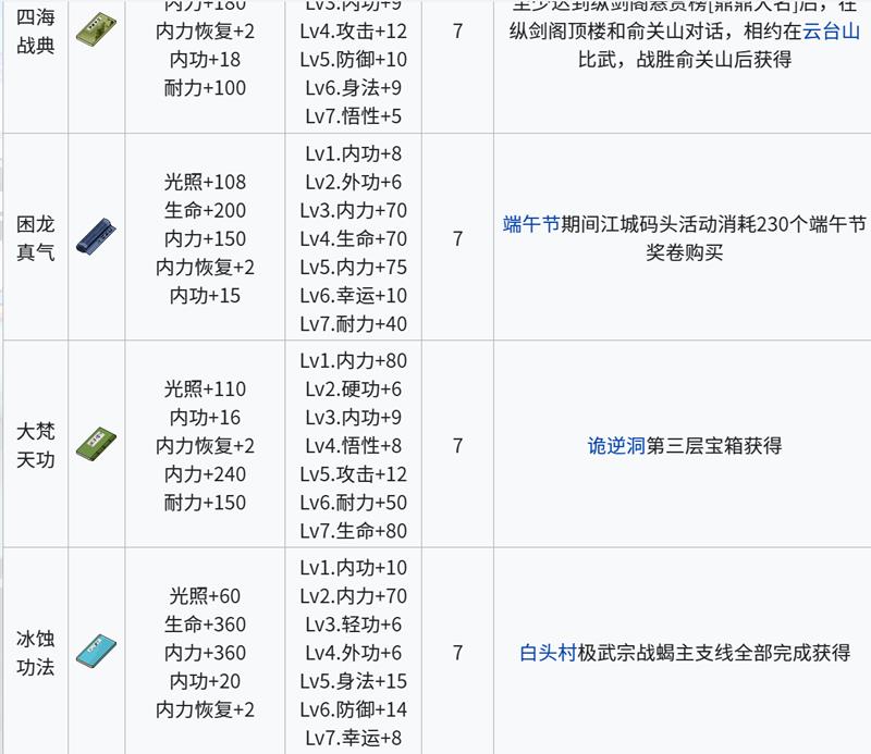 四海战典、困龙真气、大梵天功与冰蚀功法为7级高品质内功。四海战典需在纵剑阁悬赏帮派中达成鼎鼎大名评定,并通过几把俞关山获取,属性远超前期心法。其余几本同样具备高额内功与内力加成,获取难度较高,通常需要完成高难度副本或隐藏任务。这类内功在江城创业记中属于进阶核心配置,适合中高阶段玩家追求属性突破。
