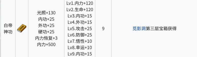 白帝神功是江城创业记中品质最高的内功心法,最高可升至9级。该心法提供130点光照、25点内功、25点外功、25点硬功、3点内力恢复以及500点内力,综合属性极为强大。可在觅影洞第三层的宝箱中找到,获取条件较为苛刻,但一旦获得将极大提升角色整体实力。白帝神功是江城创业记后期玩家追求的终极目标之一。