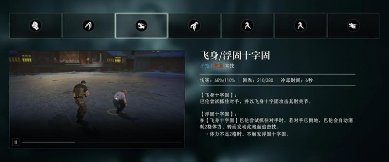 飞身十字固是巴伦的近身抓取技,成功命中后会将敌人锁住关节并空中下砸。若敌人已倒地,技能会转变为浮固十字固,在地面追加锁技,造成的伤害明显高于站立状态下的抓取。该技能拥有高额怒气回复效果,分别可回复210或280点怒气,有助于快速积攒大招能量。但由于技能前摇较明显,在面对频繁跳跃或位移的对手时容易空放。建议在异人之下手游对战中先用破势突击击倒敌人,再衔接此技能以提高命中率。