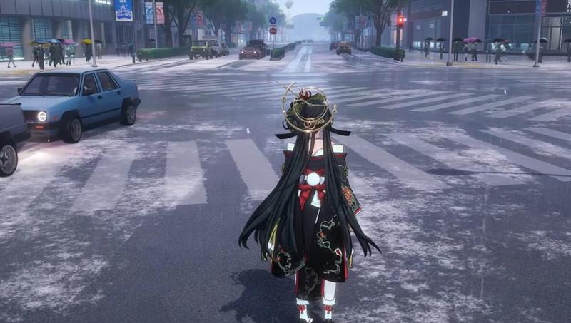 异环的天气系统突破了传统游戏中仅用粒子特效和音效营造氛围的局限,真正实现了环境与玩家行为的实时互动。雨雪不再只是飘在空中的贴图,而是会随着时间推移在地面真实积累。下雪过程中,车顶会从零星落雪逐渐堆积成厚厚一层,道路和屋顶的积雪厚度随时间动态变化,呈现出接近现实的视觉层次。这种细节不仅提升了画面表现力,也让玩家在驾驶或步行时能直观感受到天气对环境的影响。