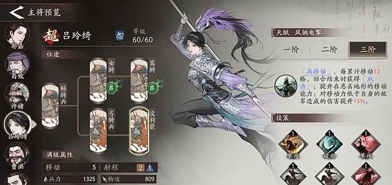 总的而言,吕麒麟是三国望神州骑兵队的核心角色,她的机动性极为出色,培养优先级高于夏侯惇。即使是零氪玩家依靠吕麒麟也能推进到300关左右,关键在于充分利用她的移动机制来触发双击效果,切忌将她当作站桩输出使用。搭配曹操和郭嘉的阵容,实战中绕后切入敌方核心输出位,她的强度完全能达到T0级别