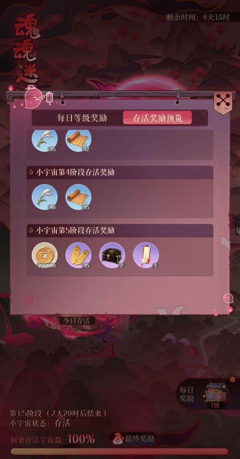 4.红月活动中共分为三种奖励:每日宇宙存活奖励、阶段存活奖励以及最终宇宙存活奖励。