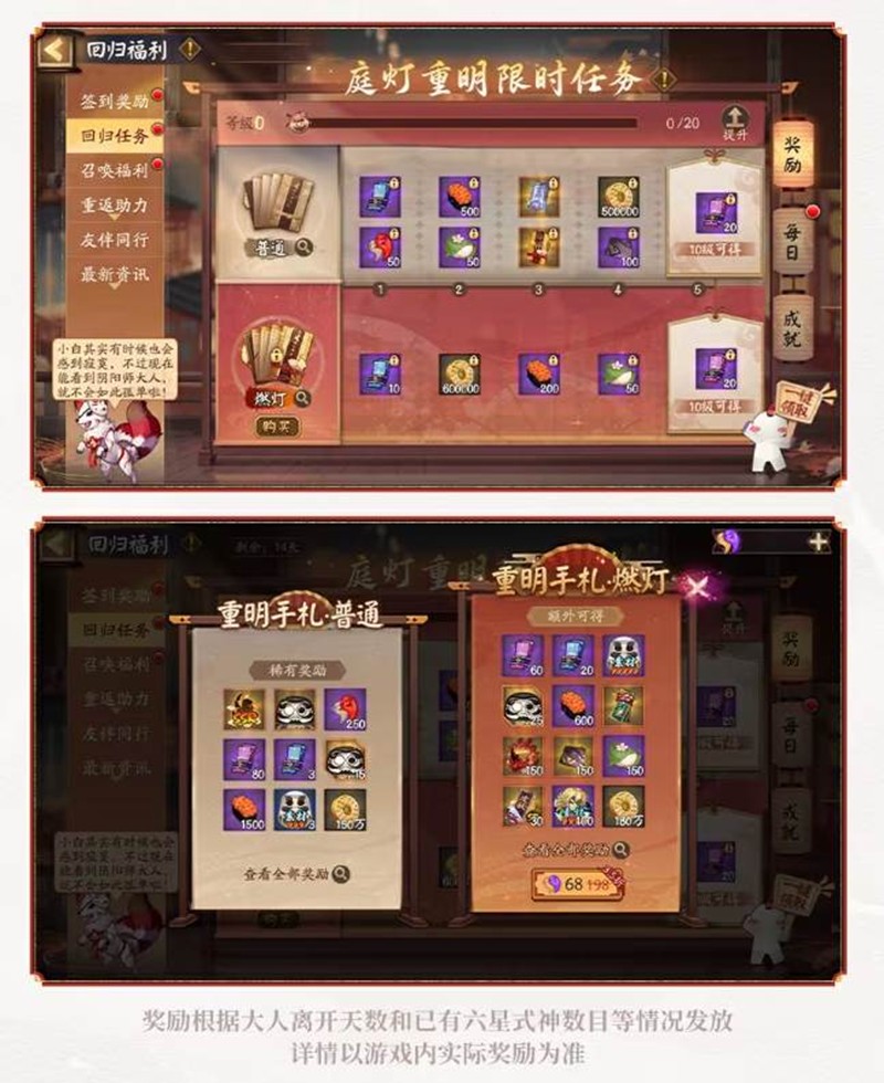 回归阴阳师大人参与「庭灯重明」活动,完成「重明手札」任务提升等级,可获得御行达摩、御行达摩(碎片)、勾玉、神秘的符咒、思归符咒、大量体力等多重奖励。购买「重明手札·燃灯」可额外获得更多丰厚成长资源。
