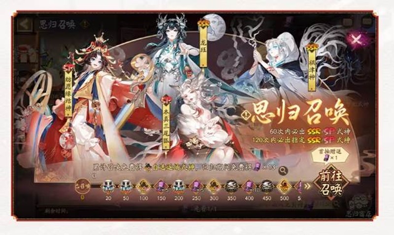 在回归期间,完成重返平安京任务,玩家可以免费获得「思归符咒」。累计召唤次数还能免费领取随机SSR/SP式神及自选SSR式神!60抽必得SSR/SP式神,120抽必出指定式神,让每位玩家都能获得心仪的式神。