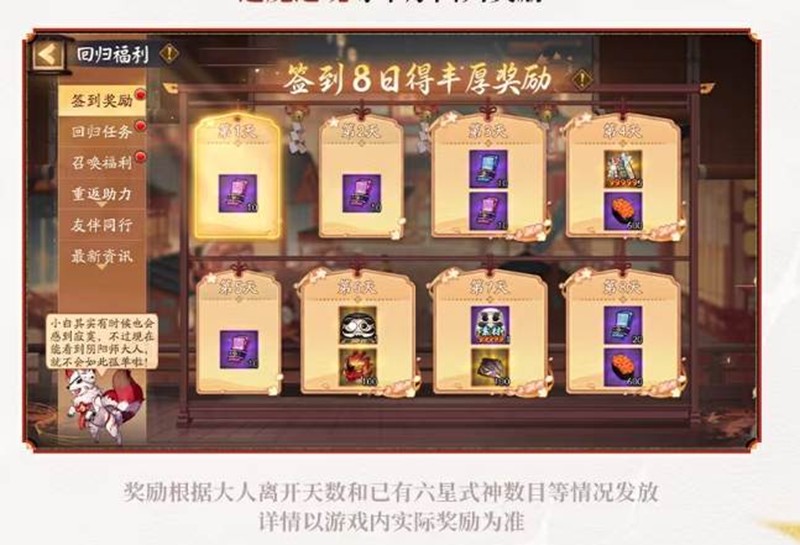 回归签到即享回归专属特权加成。活动期间登录即可领取大量体力、神秘的符咒、思归符咒、御行达摩碎片、逢魔之魂等丰厚回归奖励。签到8日更可获得丰厚奖励,让玩家的冒险之旅更加顺畅。