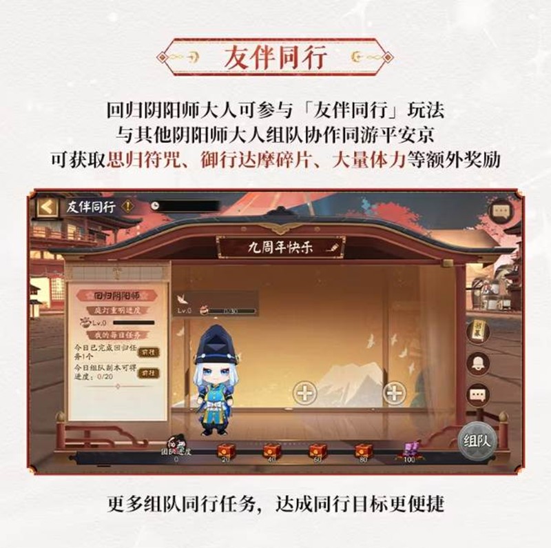 回归阴阳师大人可参与「友伴同行」玩法,与其他阴阳师大人组队协作同游平安京,可获取思归符咒、御行达摩碎片、大量体力等额外奖励。更多组队同行任务,达成同行目标更便捷。
