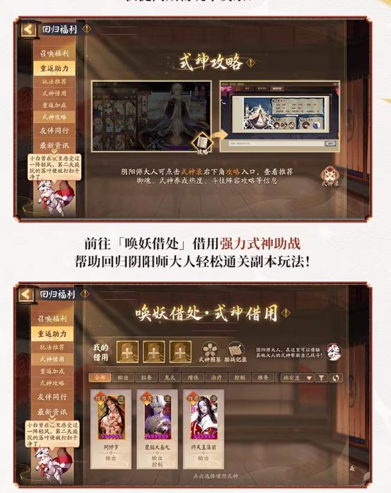 回归阴阳师大人可通过「玩法推荐」熟悉游戏玩法,一站式引导大幅减负。同时,前往「唤妖借处」,借用强力式神助战,帮助回归阴阳师大人轻松通关副本玩法。
