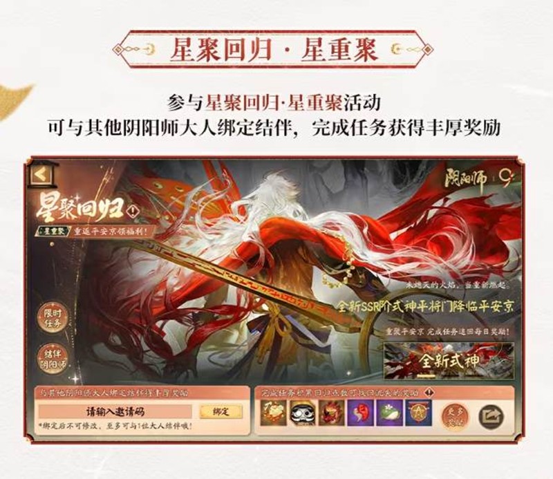 参与星聚回归·星重聚活动,可与其他阴阳师大人绑定结伴,完成任务获得丰厚奖励。全新SSR阶式神降临平安京~