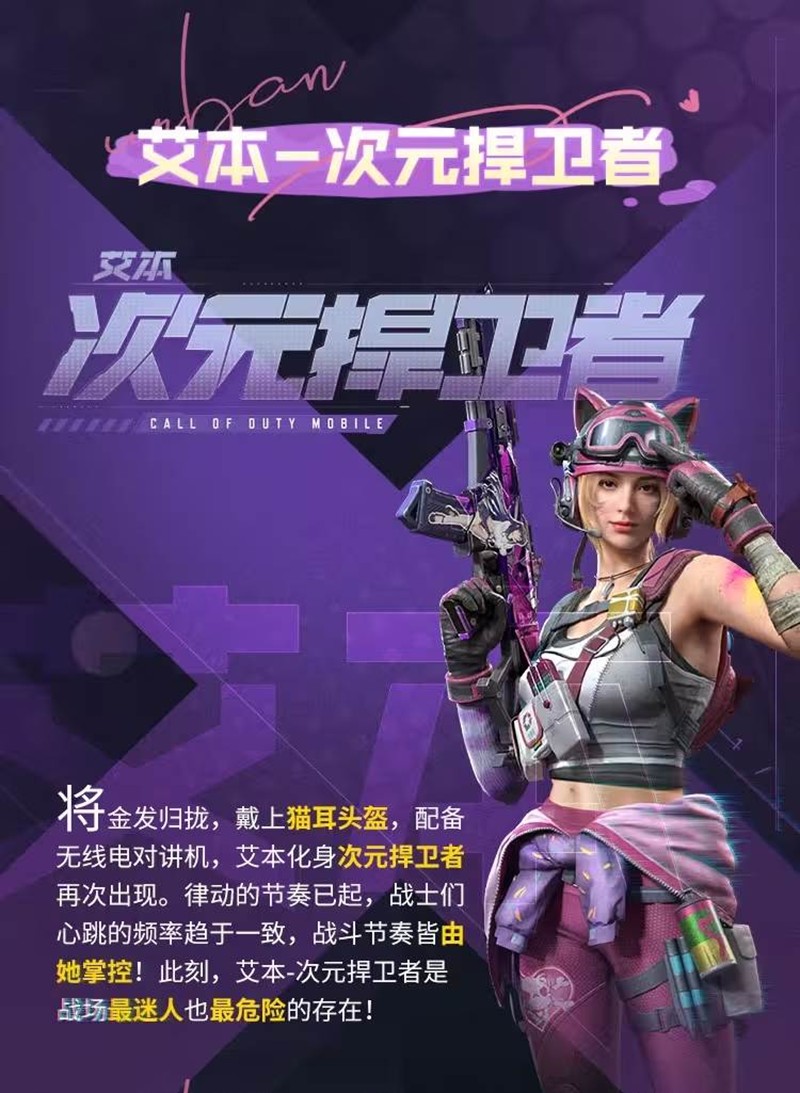 随着明日活动开启,艾本化身次元捍卫者,将金发归拢,戴上猫耳头盔,配备无线电对讲机,再次出现。律动的节奏已起,战士们心跳的频率趋于一致,战斗节奏皆由她掌控!此刻,艾本-次元捍卫者是战场最迷人也最危险的存在!