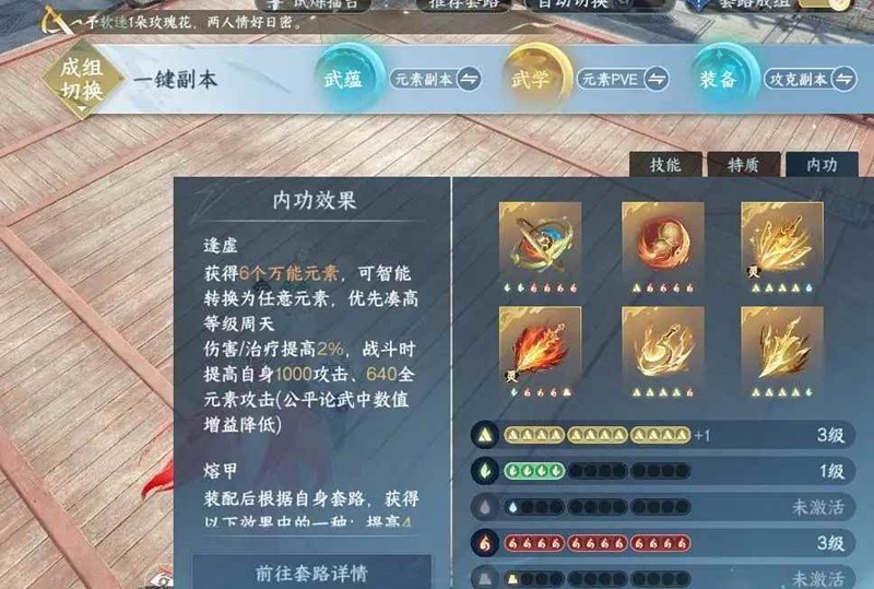内功:破宵,昆吾,熔甲,汲川,逢虚必带。然后破戟和灼锋二选一。(灼锋建议3灵韵以上,不然还是选破戟),属性优选元素攻,会心,气海,攻击,命中,身法。(最好是4攻以上带双元素最好)