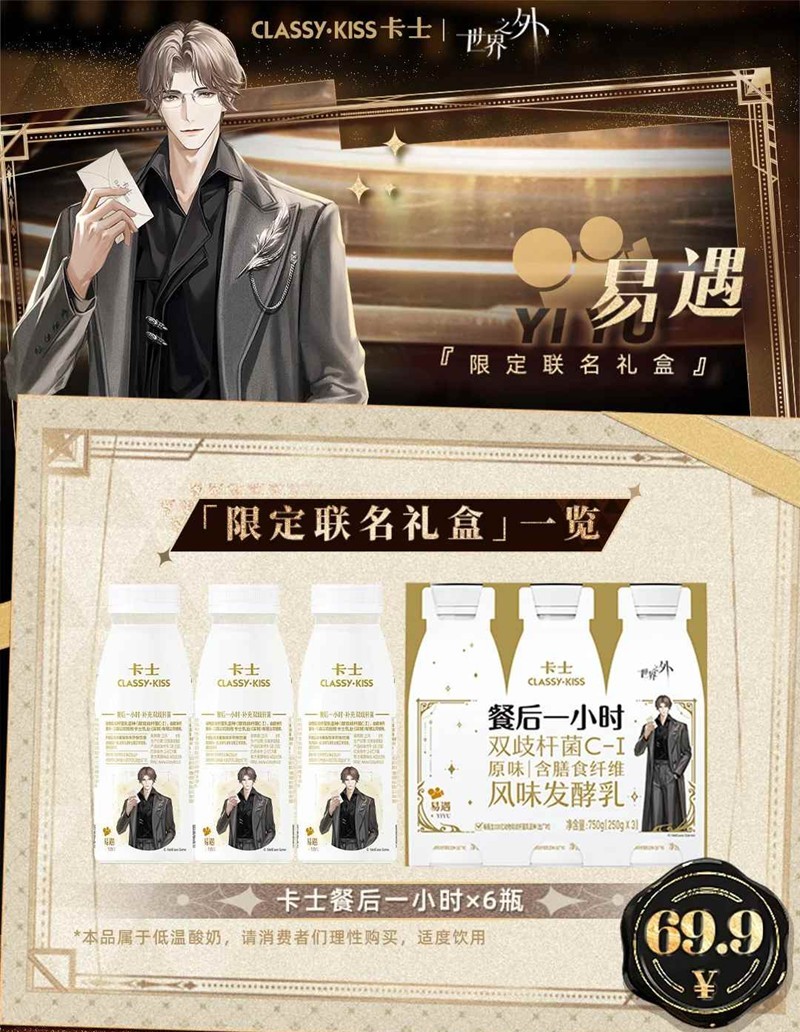 世界之外x卡士限定联名礼盒 将于10月13日开售,世界之外xCLASSYKISS卡士联动邀约,期待与你,共同品味……每款礼盒内含:「餐后一小时」联名酸奶*6,附赠对应男主个人周边礼盒*1、徽章*1、色纸*1、拍立得卡*1、镭射票*1,一起来和小编看看吧~