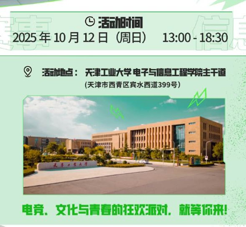 和平精英高校电竞派对天津站暨动感地带校园电竞联赛秋季赛即将来袭,高校电竞派对天津站暨动感地带校园电竞联赛秋季赛即将在2025年10月12日(周日)13:00-18:30于天津工业大学电子与信息工程学院主干道(天津市西青区宾水西道399号)隆重举行。本次活动由和平精英和动感地带联合举办,为广大高校电竞爱好者提供一个展示自我、挑战极限的平台。