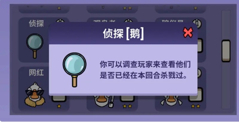 侦探可以通过技能探测附近玩家是否在本回合内有过击杀行为,显示为白色代表未杀,红色则代表已杀。该技能对锁定鸭子有显著帮助,尤其在多人聚集时可逐一排查。但面对鹈鹕类角色时技能失效,所有目标均显示为无击杀记录,因此在遇到鹈鹕时需结合其他线索进行判断。