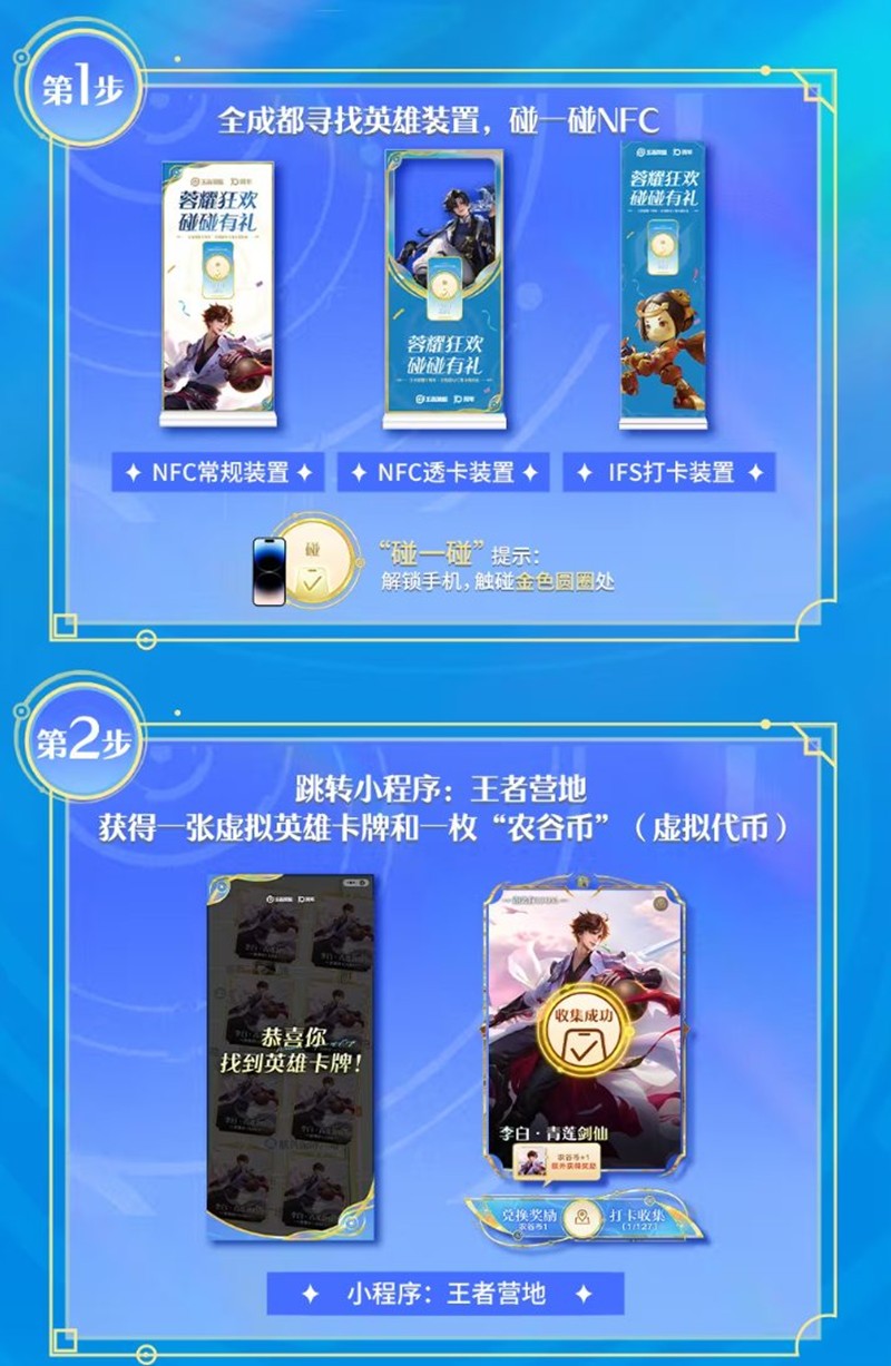 在成都的多个地标位置,玩家可以通过NFC技术与英雄装置进行互动,收集英雄卡。这些装置分布在市中心片区、商业步行街片区、武侯祠片区和芳草街片区,共计超过127个英雄NFC立牌装置。