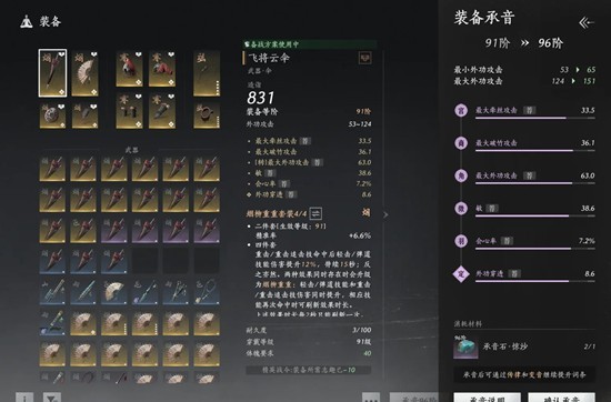 通过以上步骤可以将91级装备继承为96装备再根据需要去提升词条的数值注意:承音装备的数值上限