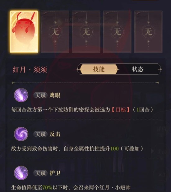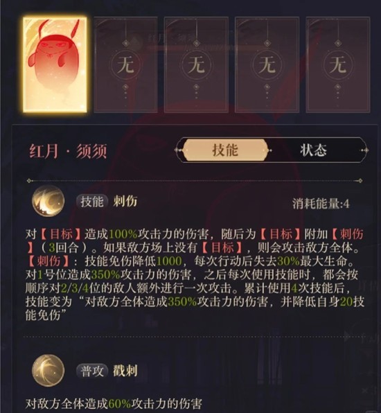 ●技能——①对【目标】单体伤害,再上debuff(刺伤:技免↓3回合,每回合失去30%生命)。无【目标】,攻击全体。②再揍一次:第一次开大揍1号位,第二次开大揍2号位,以此类推。开完4次大后改成揍全体并且降低自己免伤。