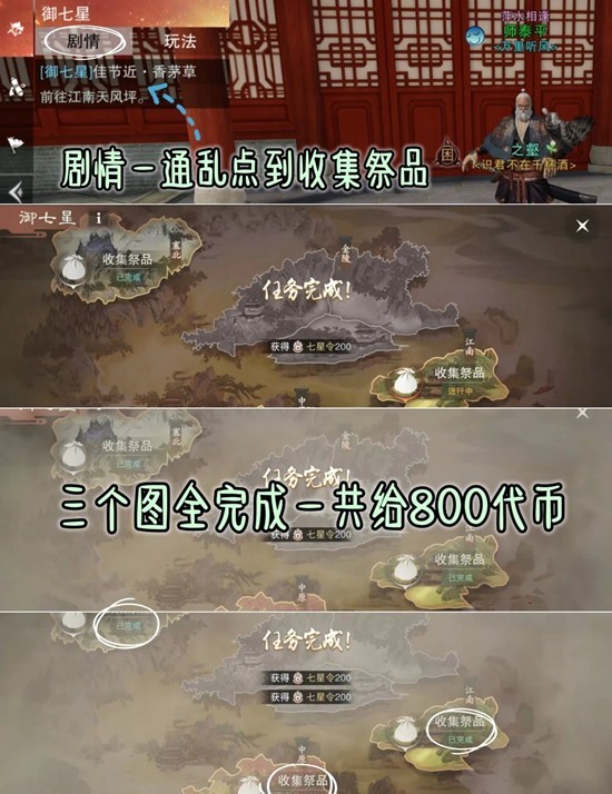 ②三个地图收集祭品200*3=600,集齐再给200,共800