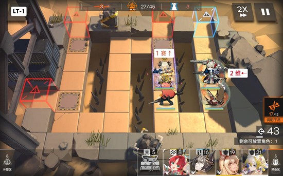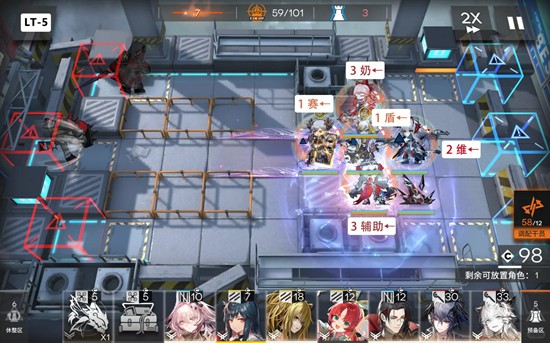 第二关:开局先放先锋在奶盾位,最上方补一个对空输出(不用叠很多层),再叠5层维配上下两个奶盾即可(有遥更好)。