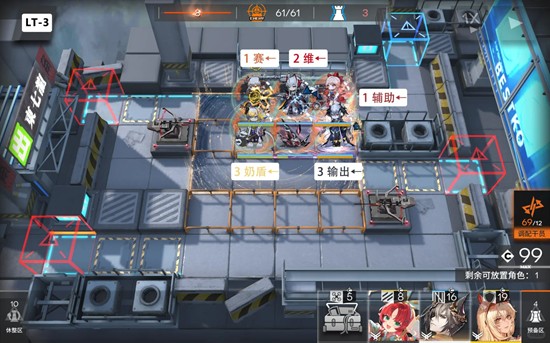 第三关:开局先摆最上方的干员,维叠五层,多配几个奶,有条件的话下面一行奶盾后面再叠个输出会比较稳。