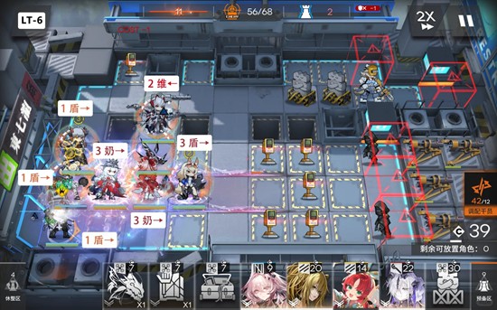 第六关:开局先摆先锋回费,周边位置多下干员,等维叠满五层部署后,抓紧叠中路前方的重装,后方蓝门口也摆上。