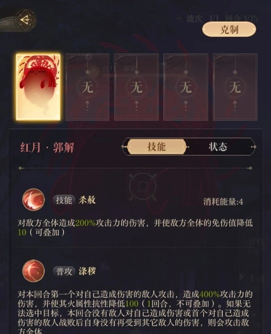 ●普攻——单体。攻击第一个打郭解的人,且降低他的火抗。