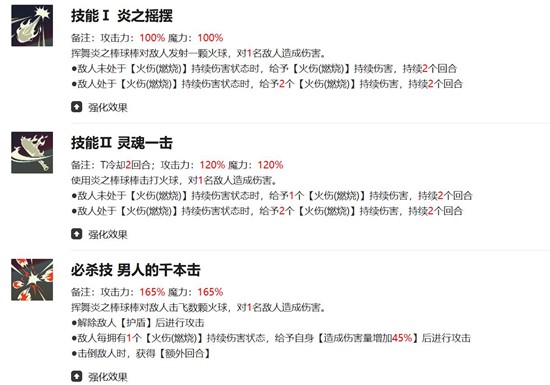 正拳技能可对单体目标造成90%伤害,并有70%概率附加持续2回合的烧伤效果,是起手挂dot的关键手段。爆杀轰炎魔球则提供110%的单体伤害,附带50%晕眩概率,若目标已处于烧伤状态则必定触发晕眩,极大提升了控制稳定性。爆杀散弹魔球为全体攻击技能,造成70%伤害的同时60%概率施加烧伤,进一步强化了团队范围压制能力。此外,他的协力技能还能降低敌方70%防御力,有效提升全队输出效率,为火伤体系的其他角色创造良好输出环境。