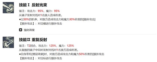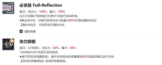 多重反射为消耗3回合能量的大招,基础伤害达到125%魔攻,若自身存在增益buff,则额外提升50%伤害,强化后还能附加22%暴击率。此技能是戈休主要的爆发来源,配合增益状态可显著提升输出效率。全反射则为范围技能,造成150%魔攻的AOE伤害,暴击时追加90%伤害,适合在群体战斗中打出成吨伤害,但需注意暴击率的堆叠,否则难以触发追加效果。