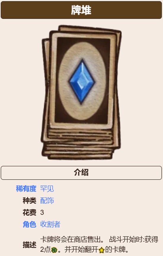 牌堆作为配饰类道具,主要服务于收割者职业,仅需3金币即可购得。其核心功能在于允许玩家在商店中出售无用卡牌,提高资源利用率。战斗开始时,牌堆提供2点幸运值加成,同时提升翻开卡牌时出现带星道具的概率。这一机制在中后期抽卡阶段尤为关键,有助于稳定获取高星级装备。