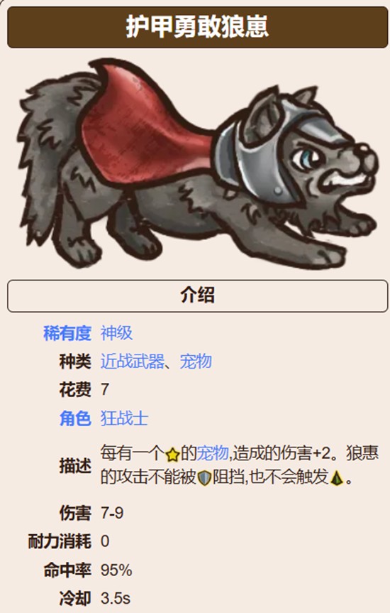 护甲勇敢狼崽是一件武器类道具,适合近战流派尤其是狂战猎职业使用,售价为7金币。建议在拥有宠物的情况下搭配使用,若宠物为带星品质,则伤害额外提升2点。狼崽的攻击无法被敌人闪避,确保每次出手都能命中目标,在面对高机动性敌人时表现尤为出色。