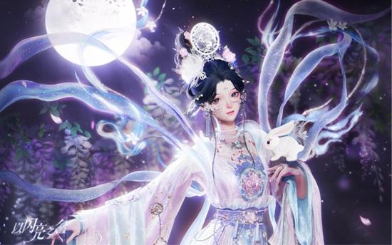 在服装设计层面,裙身采用大面积绣花及暗纹效果,整体更显端庄,在大袖的花纹上又加入了活泼感的玉兔昙花璎珞图案,裙摆上做了云纹镂空和流光特效,增加了梦幻的感觉。