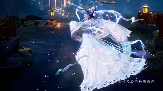 除此之外裙身出还加入风场的动态效果,让裙子在静态下也能呈现随风飘动,仿佛仙子在月宫飞行,裙摆处白色纱裙根据原画的设计增加了星点流光特效以及若隐若现的光斑特效使得衣服更加的梦幻。