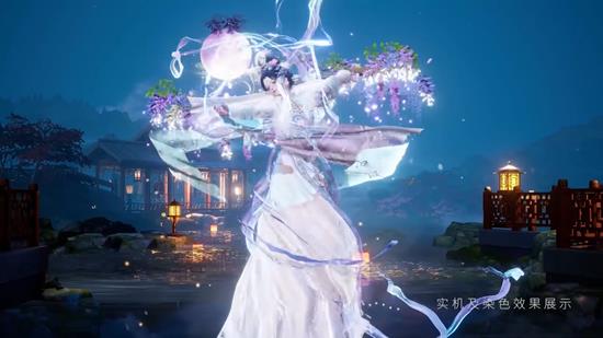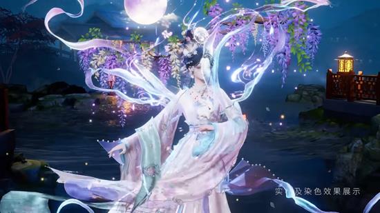 巨大的拖尾和翻飞的特效流云飘带让整个造型更加神圣华丽。背后的藤萝花枝加上一轮明月高高挂起让整个氛围呈现仙境般的美丽。