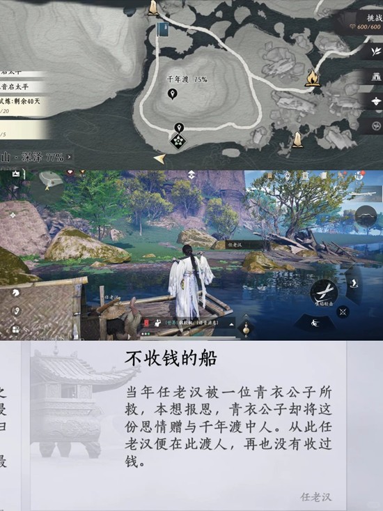 继续顺着这条小路向南走,在分岔口向右转,河边有只小船,和船上的任老汉对话