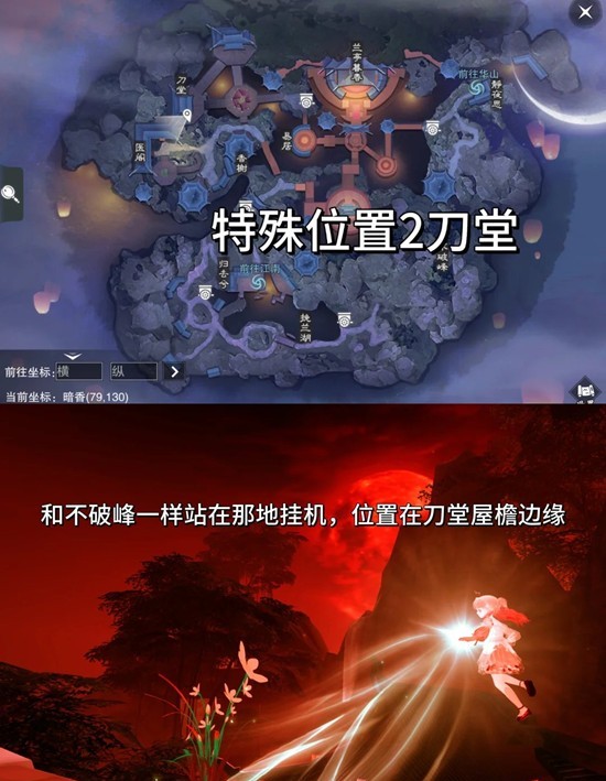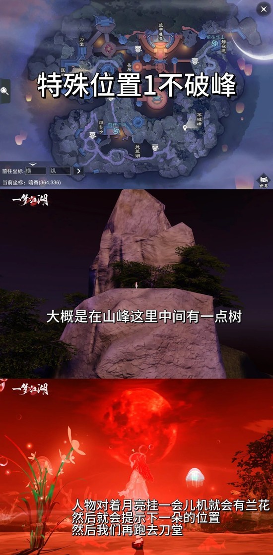 特殊兰花位置在图2跟图3标注了,到了以后需要屏幕对着血月挂会机,会自己出现哒,
