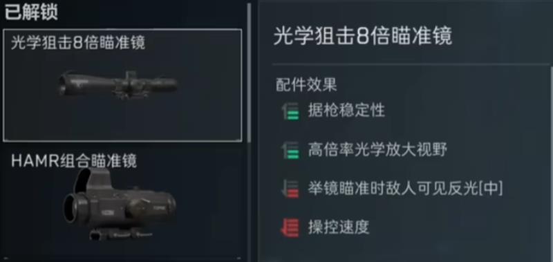 枪口配件方面建议选择实用消焰器,不过这并不是唯一选择,玩家可以根据自己的使用习惯进行调整。左右导轨镭射在狙击对决中作用相对有限,可以选择不装配。上导轨可以搭配组合护木,再配合光学狙击8倍瞄准镜,这样一套完整的改装方案就基本成型了。