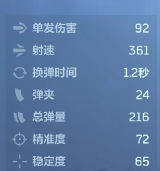 逆战未来苔色暴风作为一款低倍镜手枪,在副武器定位中拥有不俗的基础属性。其单发伤害为92点,射速达到361,换弹时间仅需1.2秒,弹匣容量为24发,总备弹量为216发。精准度与稳定性分别为72和65,在同类手枪中属于上游水平。这些数据使得苔色暴风在快速拔枪补枪时具备良好的操控性,尤其适合在主武器换弹间隙进行应急输出。