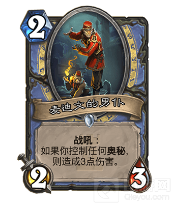 咳咳,回到正题来。男仆这张牌标准身材,前期2费拍无异能,当做功能卡中期打3效果是不会差的,等于2费是打出一个无冰冻寒冰箭加一个占场的效果吧。前期如果手上能拿到浮龙或者呓语魔典这张牌可以不用留,中期拿来解解怪还是不错的。