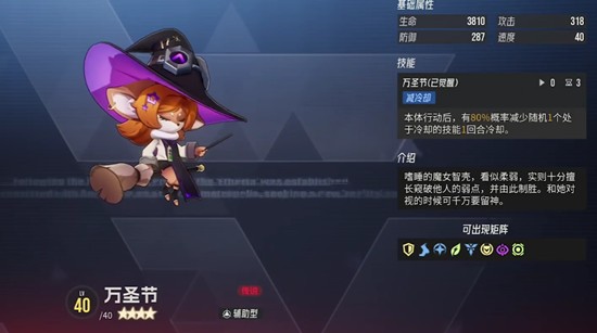伊瑟万圣节作为传说级别的辅助智壳,基础属性配置较为均衡且偏向功能性。其生命值达到3810点,防御为287点,攻击力为318点,速度属性高达40点。这一速度成长使其在同类辅助中具备明显先手优势,穿戴者往往能在战斗初期率先行动,为团队争取节奏主动权。较高的生存属性也保证了其在前线持续提供支援的能力,不会轻易被敌方集火打断功能链条。