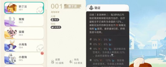 奶丁汪作为崩坏因缘中广受喜爱的小狗型精灵,不仅外形讨喜,其核心机制也极具实用性。它所拥有的“饱足”元理,配合“冲锋员”标签,使其在队伍中兼具辅助与功能性价值。该元理最显著的特点是能够召唤出丰饶神种,每隔三秒为己方全体精灵施加一次稻花治疗效果。该治疗量基于目标当前已损失生命值的12%进行恢复,在精灵处于残血状态时回血效率尤为突出,极大提升了团队的持续作战能力。
