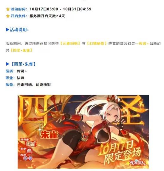 活动期间,通过限定召唤可获得【元素回响】与【幻境秘影】阵营的法师幻灵——传说+品质幻灵【四圣·朱雀】。
