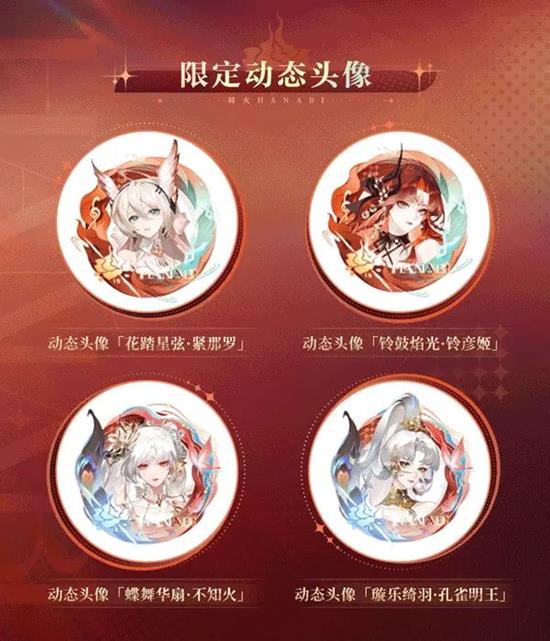 4款动态头像:「花踏星弦·紧那罗」、「铃鼓焰光·铃彦姬」、「蝶舞华扇·不知火」、「璇乐绮羽·孔雀明王」