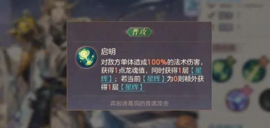 普攻可以恢复龙魂值,并且在恢复后还能获得星辉效果。当星辉层数为零时,还能额外获得一层星辉。当星辉层数达到七层时,可以立即释放特殊效果。怒攻效果方面,虽然无法直接获得怒气,但拥有七层星辉时,消耗七层星辉就能获得一次怒攻机会。释放怒攻后,会对所有敌方单位造成法术伤害。
