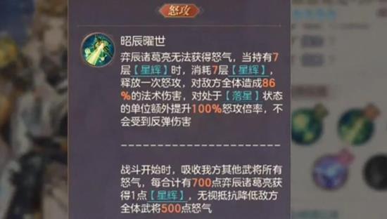 当敌方成员处于落星状态时,即使满血也可能被直接秒杀。战斗开始时,弈辰诸葛亮会吸收我方武将的怒气,每吸收700点怒气就能获得一点星辉,这个效果会无视敌方全体的怒气抵抗。