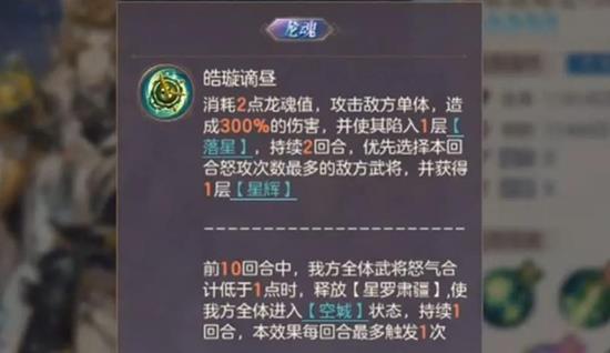 龙魂技需要消耗两点龙魂值,攻击敌方单体造成300%的伤害。同时会使目标进入持续两个回合的落星状态。在这个状态下,如果使用怒攻次数较多,就可以重新获得星辉效果。三国志幻想大陆弈辰诸葛亮的技能机制确实比较复杂,但熟悉后能发挥很强的作用