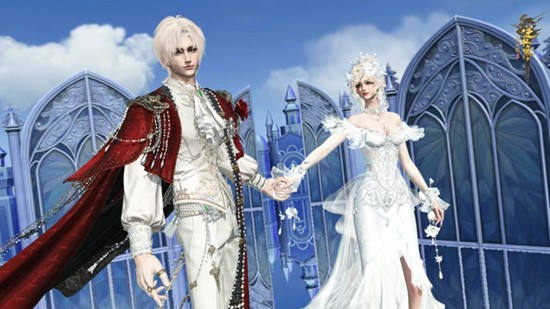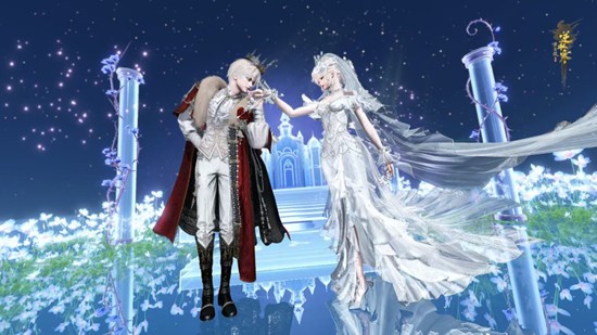 时装自带的双人动作【辉庭誓约】,这让你们携手踏上长阶,在星月、烟火、城堡的见证下,许下一生的誓言!