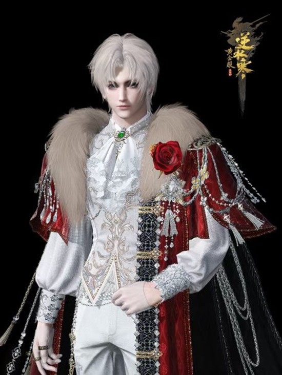 男款【盛夜星誓】高贵又威严,猩红色的天鹅绒礼袍上满是宝石,奢华毛领、黄宝石王冠,显得身形高大、压迫感十足。