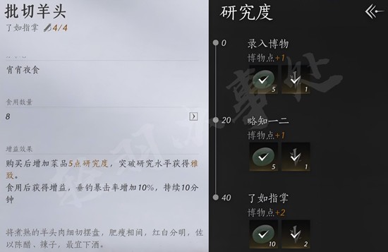 博物志和探索属性相关内容:菜品每吃1次可增加5点研究度,研究度每突破一层水平可获得雅致属性,每种食物吃8次即可到达了如指掌水平,一个食物总计可获得4点雅致属性